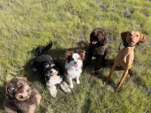 A group of dogs trained by Dog Training Together enjoy a group hike.