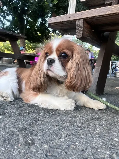 Penny the Cavalier King Charles Spaniel puppy practicing her down-stay at a local dog-friendly brewery in the Easy Bay.